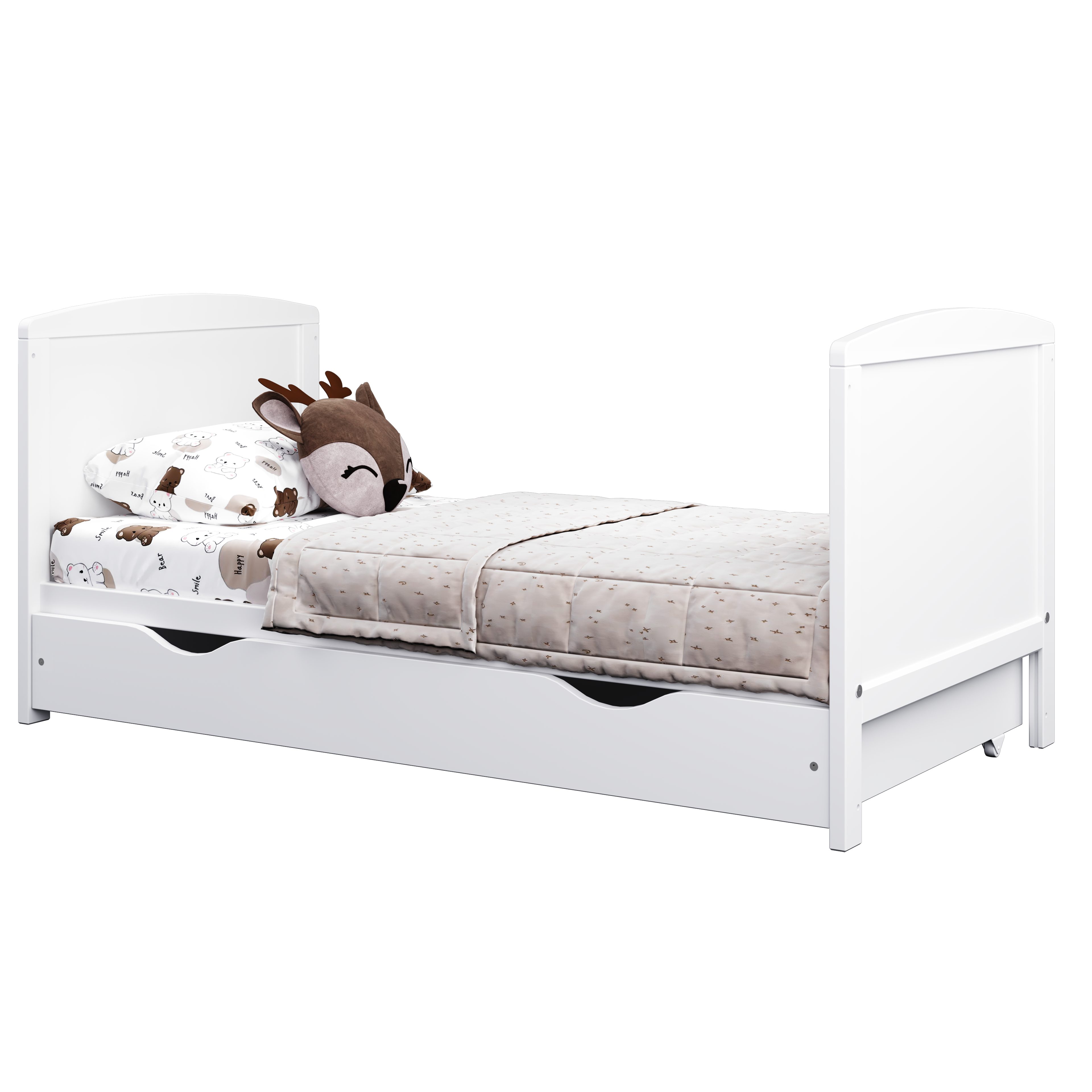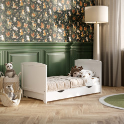 Le tiroir intégré sous le lit offre un espace de rangement discret et pratique pour les draps, gigoteuses ou jouets. Tout est à portée de main sans encombrer la chambre.