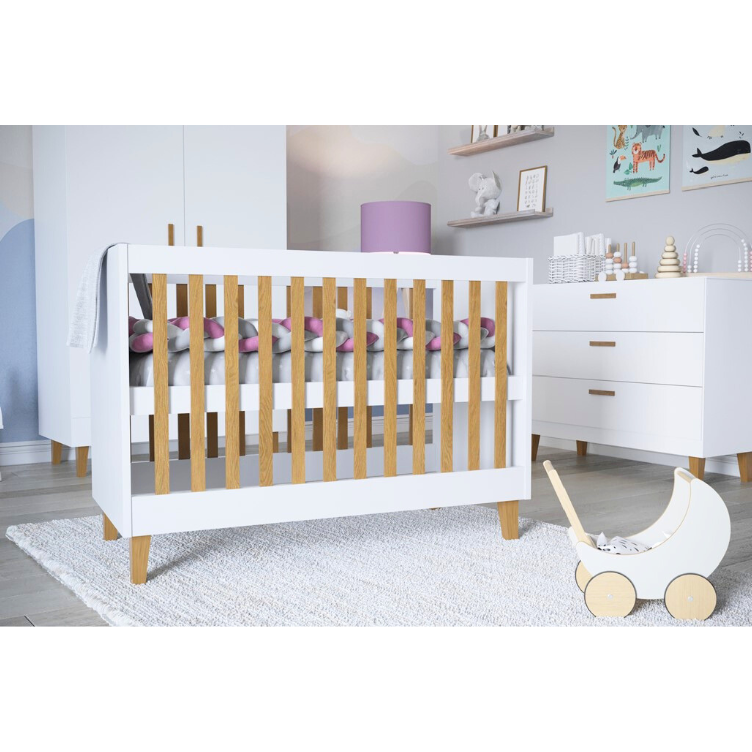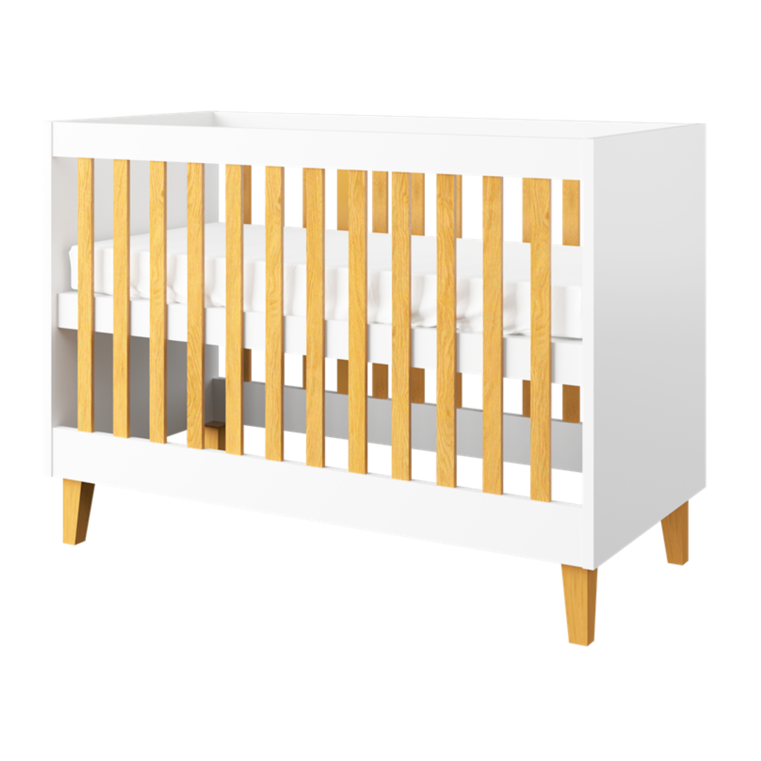 Composition : Les pieds et les barreaux du lit bébé Victor sont en chêne massif, recouverts d’un vernis transparent. Le reste du lit est composé de panneaux de particules mélaminés certifié de 18 mm d’épaisseur, avec une finition blanche.