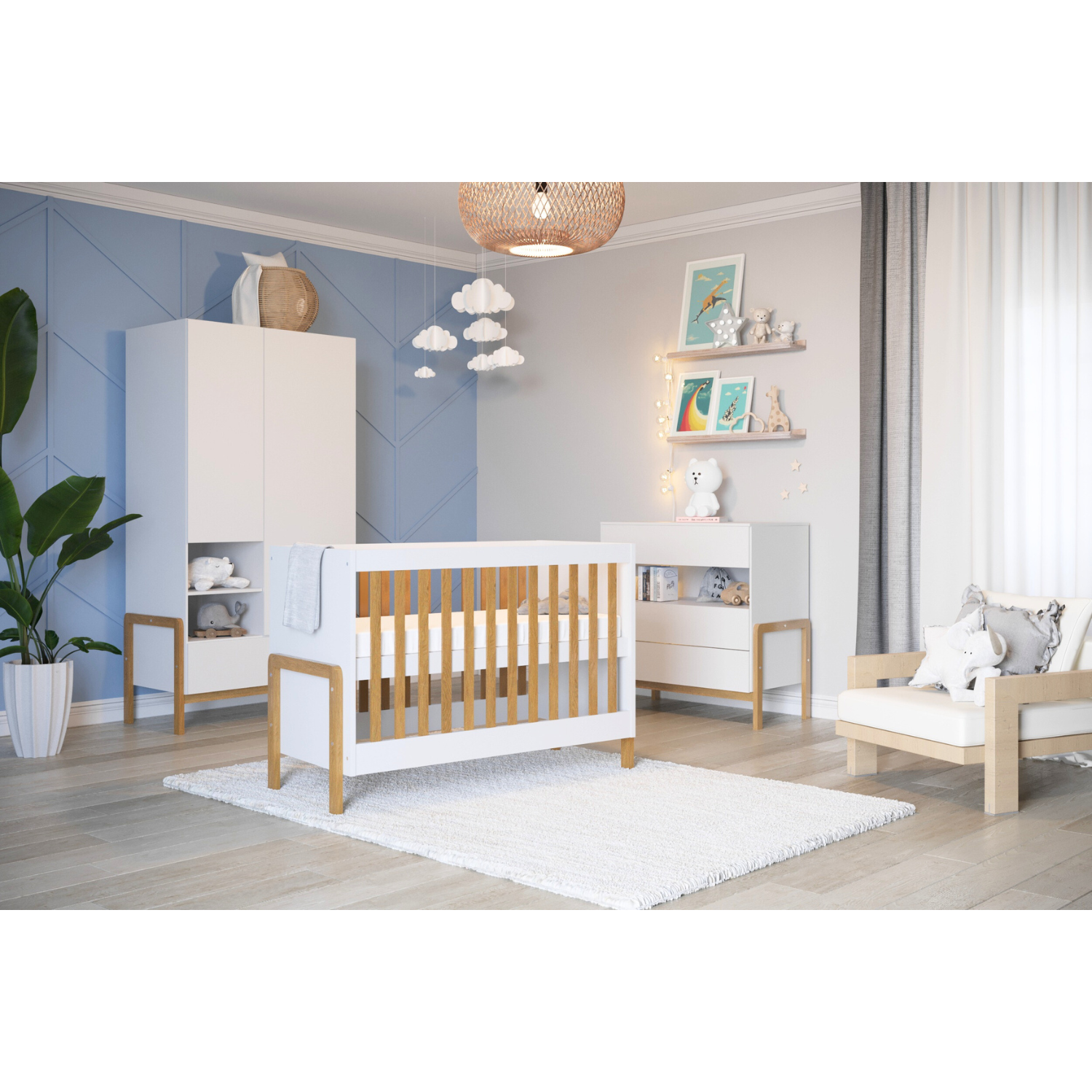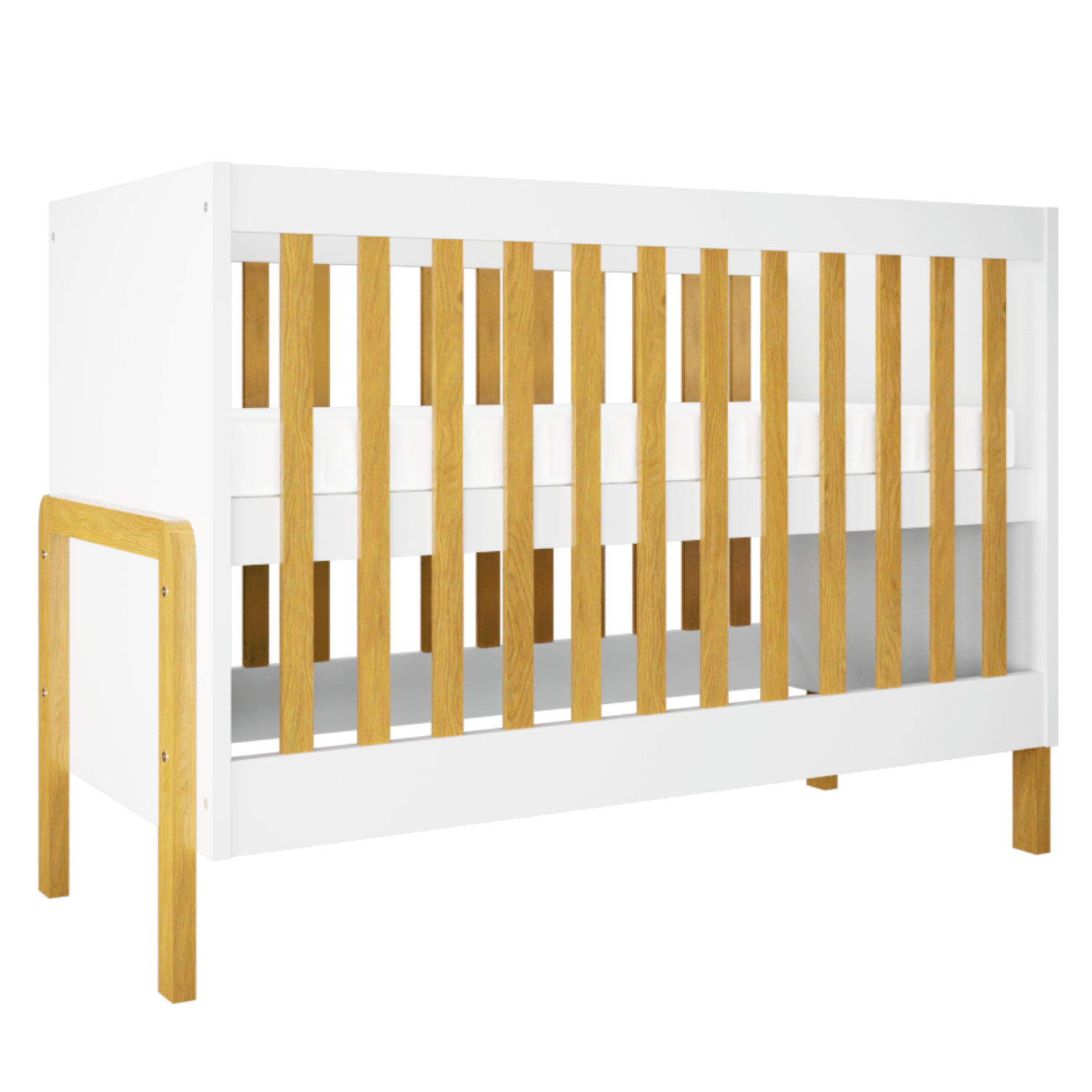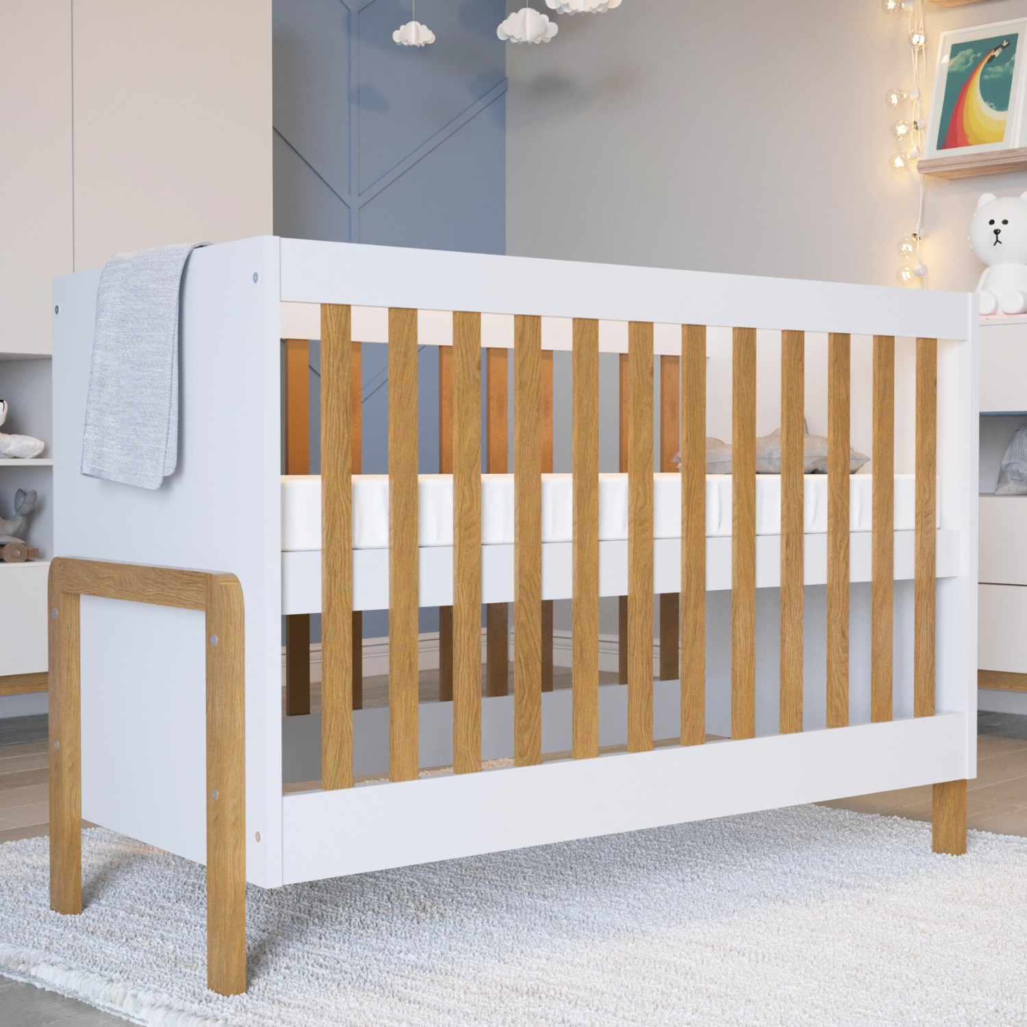 Composition : Les pieds et les barreaux du lit bébé Victor sont en chêne massif, recouverts d’un vernis transparent. Le reste du lit est composé de panneaux de particules mélaminés certifié de 18 mm d’épaisseur, avec une finition blanche.