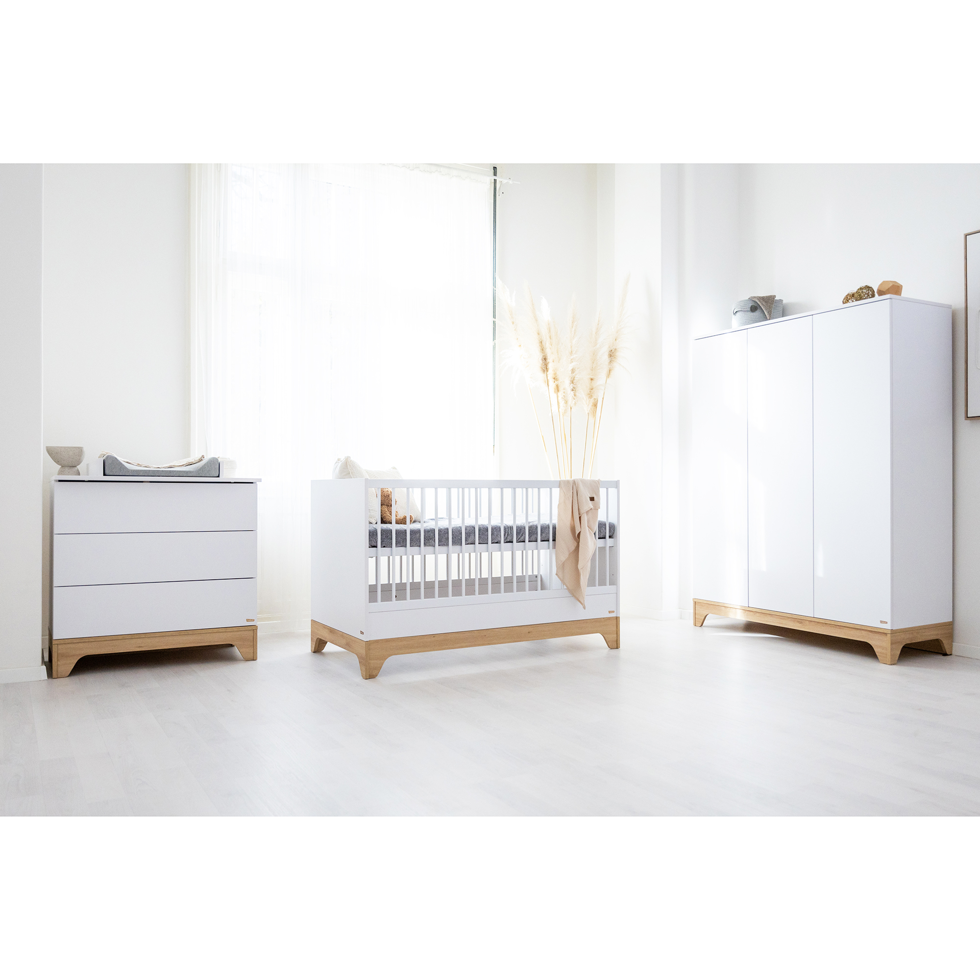 Le sommier réglable sur trois hauteurs permet de s’adapter à l’évolution de bébé : position haute pour les premières semaines, position intermédiaire quand il commence à bouger davantage, et position basse pour garantir sa sécurité quand il se redresse seul. Une solution pratique, sans effort.