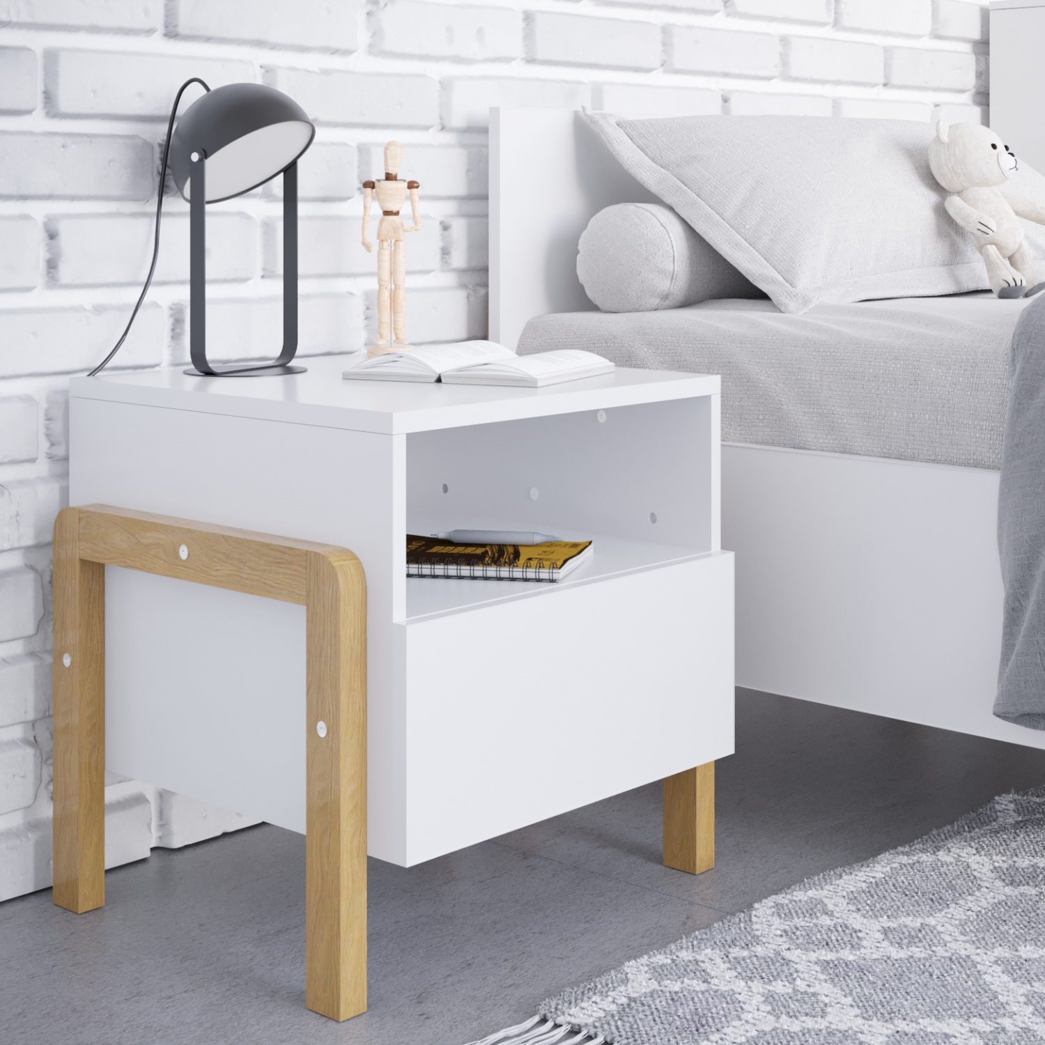 Cette jolie table de nuit enfant au style scandinave trouvera facilement sa place dans tous les styles de chambre. Rangez et organisez les affaires de votre enfant en toute simplicité. La table de nuit dispose d’un spacieux tiroir à fermeture silencieuse et d’une petite étagère.