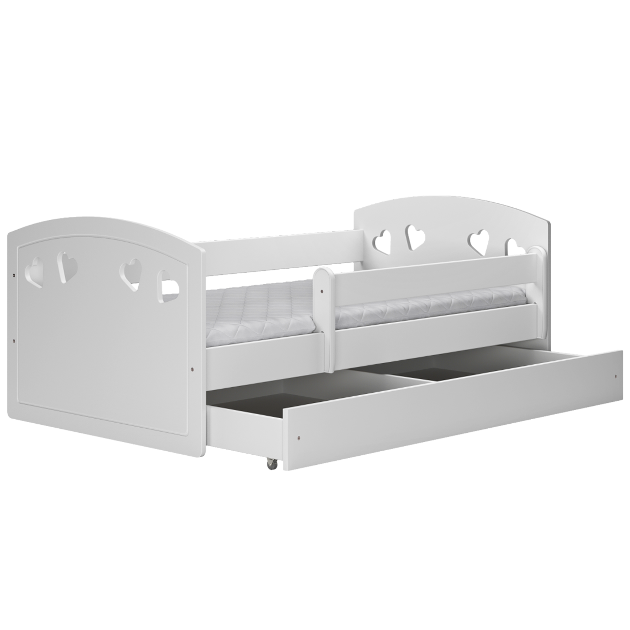 Avec son joli design, le lit pour enfant JULIA et ses jolis petits cœurs trouve facilement sa place dans tous les styles de chambre. C’est le lit idéal à utiliser après le lit bébé à barreaux. Sa barrière de sécurité amovible permet un passage en douceur vers un vrai lit de grands et d’éviter ainsi tout risque de chute pendant la nuit. Tous les angles du lit sont arrondis pour éviter les petits bobos du quotidien.