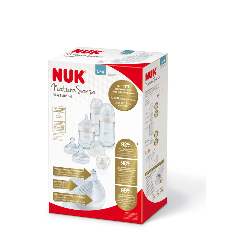- 3 biberons NUK Nature Sense en verre dont 1 biberon de 120 ml, 0-6 mois, perçage S pour les infusions et le lait maternel et 2 biberons de 240 ml, perçage M pour le lait, capuchon protecteur antifuites, sans BPA